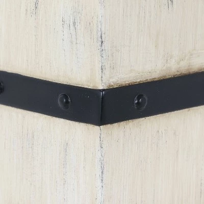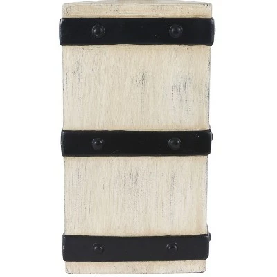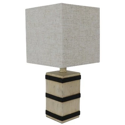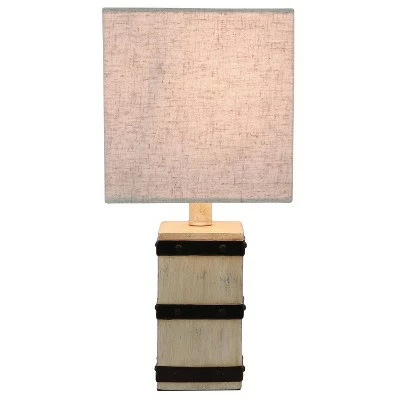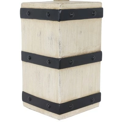 This square barrel accent lamp packs all charm and character of wine country. A square base features a barrel design, complete with heavy metal studded accents. Straight lines continue into the hardback drum shade, which is crafted in natural linen. Constructed of poly resin. Requires one (1) 40 watt bulb, not included.