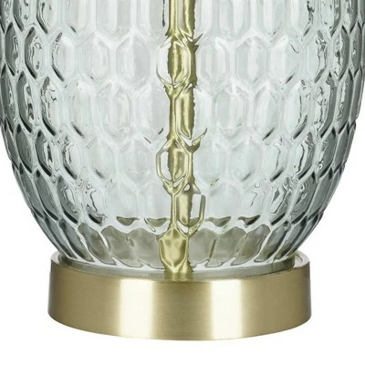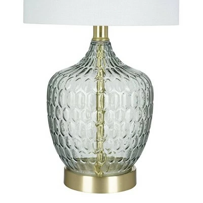 - The mix of textured glass finished in a transparent hue of smoke Gray mixed with satin brass metal accents makes this table lamp the perfect accent piece to blend with any décor.