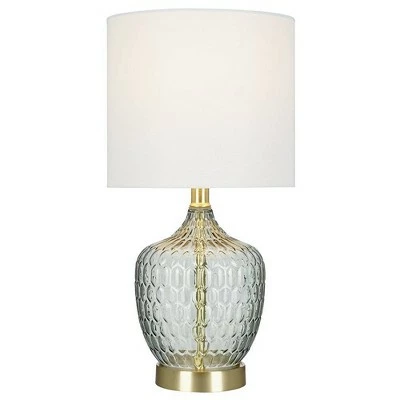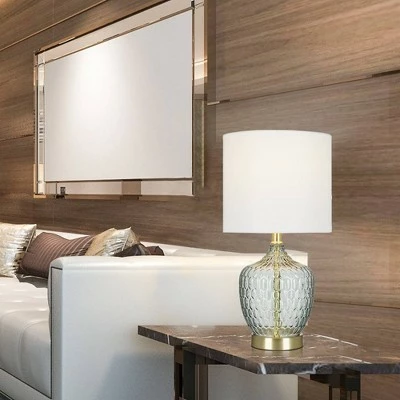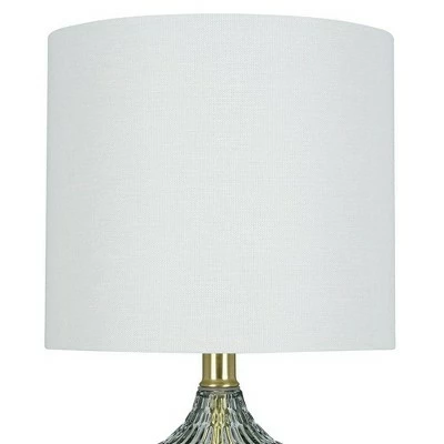 Bring a sophisticated update to any living space with this on trend gourd shaped glass table lamp. With its crisp white linen drum shade mixed with the smoke gray tinted textured glass surface, this table lamp will add visual interest and a soft modern look to any style and room décor. Make a statement by pairing next to your bedside or favorite sofa to bring together a balanced and cohesive look.