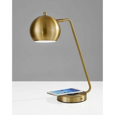 The Emerson AdessoCharge Table Lamp is a mid-century modern style table lamp that includes a wireless charging pad with Qi inductive charging technology. Many smartphones (list below) have Qi technology built in, so just place your phone on the pad and it will charge right up. No cords, no mess. It’s that easy! All AdessoCharge product is Qi certified by the Wireless Power Consortium. Please visit wirelesspowerconsortium website to see a list of Qi certified products. Our product has been tested and verified to be safe and in compliance with the Qi standard. The AdessoCharge pad supports 5W charging on contact with the charging pad, which gets your phone from 0% to 100% in just 3-4 hours, depending on your phone model. A USB is located on the base and can charge up a second device simultaneously. AdessoCharge is unique in that you can use the AdessoCharge pad, the USB and the light all at the same time with maximum efficiency of all three. A simple rotary switch located on an adjustable globe shade turns the lamp on and off.
