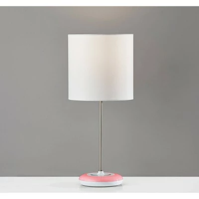 Upgrade your bedside or office with this multi-functional Table Lamp. Use the Mia Color Changing Table Lamp for simple ambient light in your home or turn on the nightlight located on the base with a simple touch of the finger. A touch color wheel controls the change of color on the nightlight base to suit any mood and add some color to your decor. Charge up your mobile devices using a convenient USB port in the base. A soft white fabric shade is paired with a brushed steel pole and a white base.