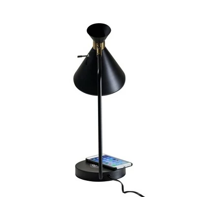 The Maxine AdessoCharge Table Lamp is a mid-century modern style table lamp with retro influence that includes a wireless charging pad with Qi inductive charging technology. Many smartphones (list below) have Qi technology built in, so just place your phone on the pad and it will charge right up. No cords, no mess. It’s that easy! All AdessoCharge product is Qi certified by the Wireless Power Consortium. Please visit wirelesspowerconsortium website to see a list of Qi certified products. Our product has been tested and verified to be safe and in compliance with the Qi standard. The AdessoCharge pad supports 5W charging on contact with the charging pad, which gets your phone from 0% to 100% in just 3-4 hours, depending on your phone model. A USB is located on the base and can charge up a second device simultaneously. AdessoCharge is unique in that you can use the AdessoCharge pad, the USB and the light all at the same time with maximum efficiency of all three. A simple rotary switch on the shade turns the lamp on and off.