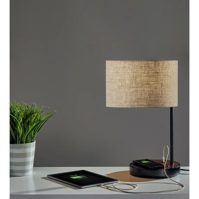 An essential addition to your bedside table, the Oliver AdessoCharge Table Lamp includes a wireless charging pad with Qi inductive charging technology. A matte black finish is mixed with walnut wood for mid-century modern appeal. A natural fabric shade reveals its beautiful texture when lit. Many smartphones (list below) have Qi technology built in, so just place your phone on the pad and it will charge right up. No cords, no mess. It’s that easy! All AdessoCharge product is Qi certified by the Wireless Power Consortium. AdessoCharge is unique in that you can use the AdessoCharge pad, the USB and the light all at the same time with maximum efficiency of all three. An easily accessible rocker switch on the base turns the lamp on and off. Just plug in the lamp and the charger will work. This wireless charging pad will charge your phone through most materials, do you do not even need to remove your case! Only metal will hinder the function of the charging pad to charge through the case. If your smartphone doesn’t support Qi wireless charging, you will need to purchase a Qi compatible case, which is sold through a variety of retail channels. Or you can also charge your smartphone with the USB port that is also included in the lamp base. Compatible with Apple iPhone 8 / 8 plus / X / Galaxy Note 8 / S8 / S8 plus / S7 / S7 edge / S6 / S6 edge / S6 edge+ / Nexus 4 / 5 / 6 / 7 / LG G3/ Microsoft Lumia 1520, 1020, 930, 929, 928, 920