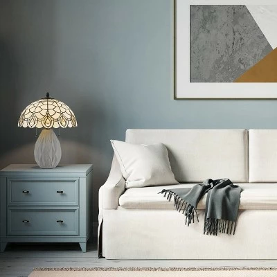 Cal Lighting makes this Tiffany resin base table lamp. This lamp has an intricate design uniquely shaped base and hand cut art glass multi-colored shade. This lamp uses two 60 watt bulbs (bulbs are not included.) Imagine how this table lamp will look great in your dining room, living room, bedroom, kitchen, family room, or office.