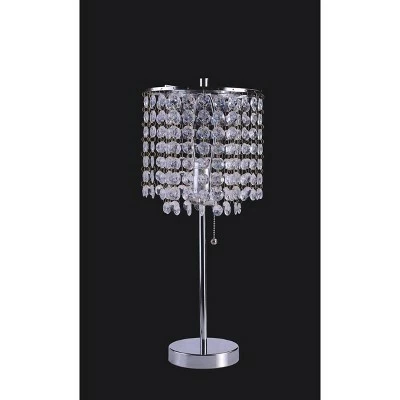 A clean touch to this delightful 20.25″H chrome lamp is ideal for transitional or glam style rooms, and makes an unexpected glistening accent mixed among traditional furnishings. Clear crystal inspired beadings surrounding the lamp with hanging crystal inspired, make this lamp a must have. Shade measures 8″L x 8″W x 8.5″H. Lamp Body measures 14″H w/ a 5″ DIA Base. Harp measures 8.75″H.