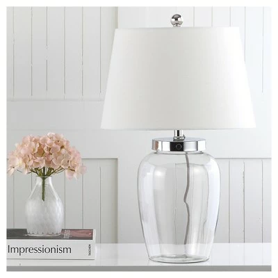 Be creative with the Evan table lamp in clear glass with iron trim in a silver finish. Designed to be used alone or filled with your choice of objects from seashells to river stones or colored beads, this lamp pays homage to the glassblower’s art. The cool transparent composition gives off effortless glamour that makes it great for modern, contemporary, or transitional style rooms. This table lamp has a rotary switch, a E26 bulb base, and a CFL bulb.