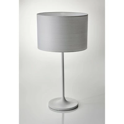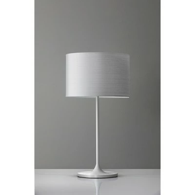 An interpretation of Scandinavian design, the Oslo table lamp features a matte white modified tulip-styled base and body and is topped with a hardback drum shade of white Japanese paper. The horizontal striped paper adds subtle pattern that is highlighted when lit. The contemporary style base is made of metal and has a chic white finish that works in almost any home décor. An on/off rotary switch is located on the socket. This lamp has a clear cord and is smart outlet compatible. Bulb is not included.