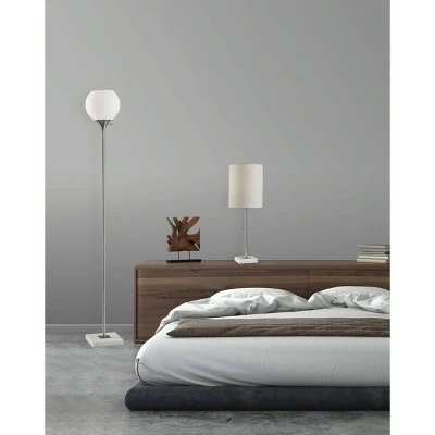 A simple silhouette is updated with high quality materials with the Fiona Table Lamp. A square, white marble base keeps the lamp sturdy and strong while adding elegance to the look. A brushed steel finish is softened with a white fabric shade that reveals its beautiful subtle texture when lit. Turn the lamp on and off with a simple tug of the pull chain switch. A clear, barely there cord trails neatly from the base.