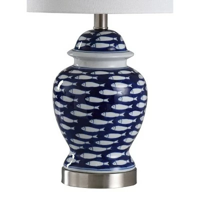 You do not have to live right by the sea to enjoy the School of Fish table lamp. The ceramic and steel lamp comes with a blue finish while the fish stand out in white. The navy blue coloring complements the base nicely, and you also get a durable shade made out of styrene. A handpainted finish means each piece is unique, with possible slight variations. No two lamps are exactly alike. This piece exemplifies superior product design and great styling. It will pair well with coastal styling and is sure to be a conversation piece. Regardless if you put it in the bedroom or family room, this table lamp stands out. Suitable for residential use in a dry location. This modern table lamp is UL listed in compliance with the nationally recognized safety standards.