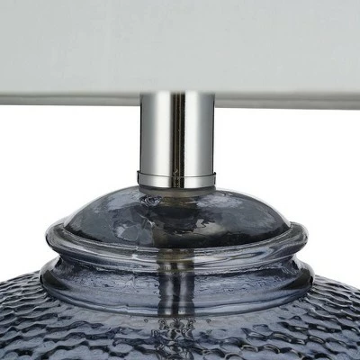 Bring a sophisticated update to any living space with this on trend gourd shaped glass table lamp. With its crisp white linen drum shade mixed with the smoke gray tinted textured glass surface, this table lamp will add visual interest and a soft modern look to any style and room décor. Make a statement by pairing on side tables or bedroom nightstands.