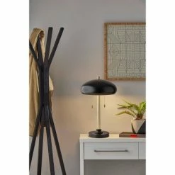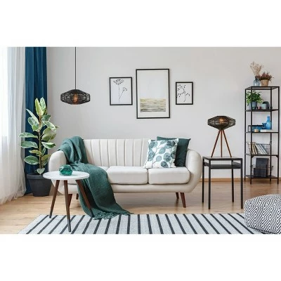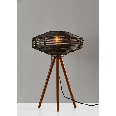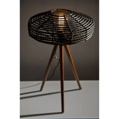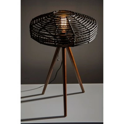 A stunning mix of natural materials, the Kingston Table Lamp is a great way to add some bohemian inspiration to a modern setting. A black rattan disc houses a globe shaped vintage bulb that is included with this shipment and adds even more decorative appeal to the look. Rich, walnut wooden legs provide a sturdy tripod construction. A black fabric covered cord neatly hangs down from the socket. Turn the lamp on and off using a simple pull chain switch.