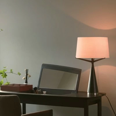 The metal base, modern industrial shape and neutral drum shade of the Novogratz x Globe Levon Table Lamp creates a stylish light that brings a composed sophistication to any room. The dark bronze finish is accented with a brushed nickel base that offers an industrial flair. Perfect for a loft space, a bedroom or a den, this lamp provides a stylish finishing touch. Decorate with the Novogratz and Globe Electric – lighting made easy.