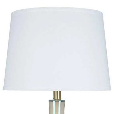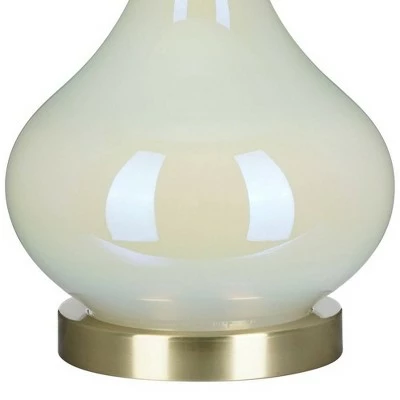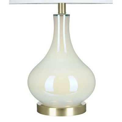 Bring a sophisticated update to any living space with this on trend gourd shaped glass table lamp. With its crisp white linen modified drum shade mixed with the white iridescent glass surface, this table lamp will add visual interest and a soft modern look to any room décor. Make a statement by pairing on side tables or bedroom nightstands.