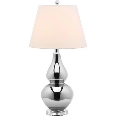 Casting a colorful glow in any room, the sparkling silver mercury Cybil Double Gourd Glass Lamp is adorned with a matching finial, base and neck. It is topped with a beautifully tapered pure cotton shade that illuminates the room. The sleek metallic composition gives off effortless glamour that makes it great for modern, contemporary, or transitional style rooms. The Drop of Rain Table Lamp has a rotary switch, a E26 bulb base, and comes with one CFL bulb.