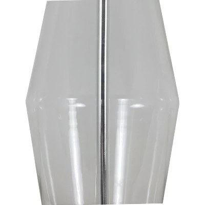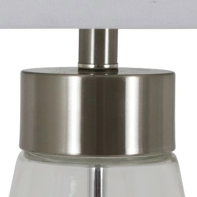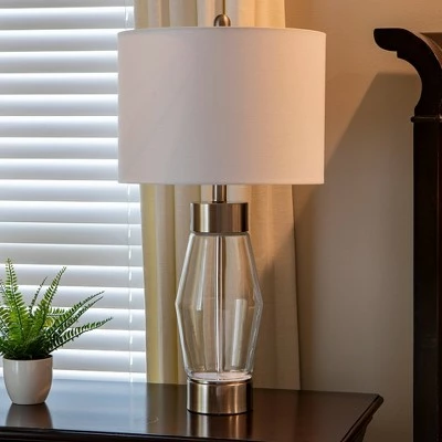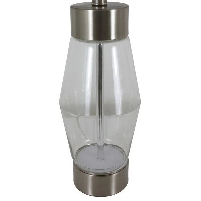 The lean, sophisticated design of this table lamp is capable of blending in or standing out with room-illuminating prowess. A convex cylindrical base is crafted in transparent glass, encasing a metal core that hide wires from sight. Wide metal discs bookend the base at top and bottom for a balance of tough and tender aesthetics. A classic white linen drum shade completes the look.
