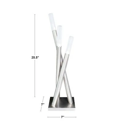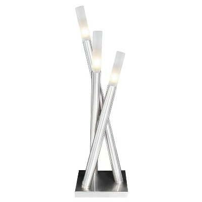 Cylindrical frosted sconces create a soft glow, accenting the modern design of the tubular brushed metal nickel arms on the Icicle Lamp. The dim feature lets you adjust the brightness to suit your needs. If you like a subtle contemporary look, this lamp is the perfect choice. The versatile design be used as a desk or task lamp. Uses 40-watt G9 halogen bulbs.