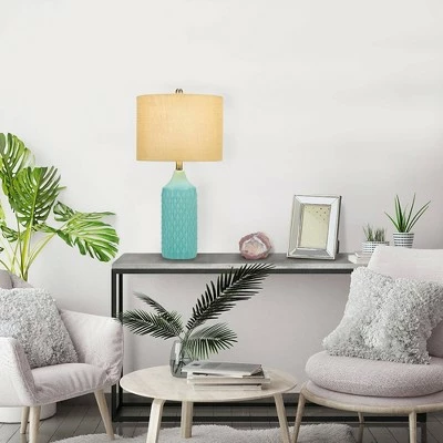 - ELEGANT AND STYLISH: This unique ceramic table lamp features a textured quilted patterned body with aqua blue finish and burlap shade. This attractive light is the perfect addition to your living room, bedroom, family room, dorm room, home office, craft room, kitchen or any open concept living space. Great for apartment living or DIY home remodeling projects and suits a variety of styles including transitional, coastal, modern, contemporary, global and traditional decor.