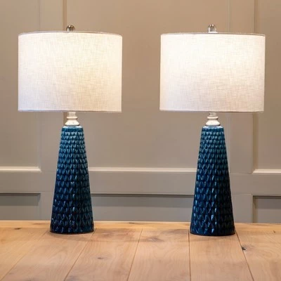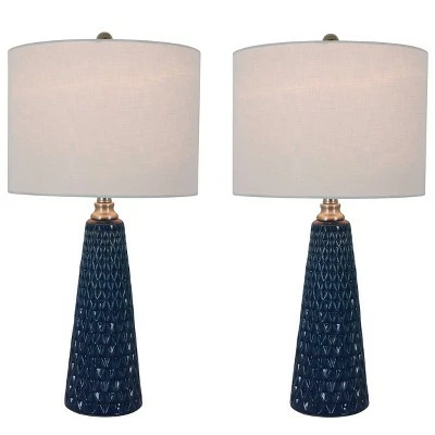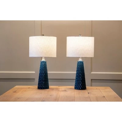 It’s the details that will elevate the design of your living space from basic to professionally inspired. The Jameson Inverted Diamond Table Lamp Set features a sleek, modern ceramic base with inverted faceted diamonds to bring bold texture and dimension to your space. The transitional style table lamps are complimented by round linen drum shades and lovely metal detailing. This set of two table lamps is ideal for framing your bed, sofa or balancing a console table design. Change it up by separating the pair in order to tie two rooms together. The Jameson Table Lamps are available in a variety of finishes. Constructed of ceramic. Required one (1) 100 watt bulb each, not included. Each lamp measures 13x13x26.5″