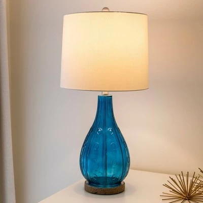 Brighten your family room or bedroom with the versatile Emma embossed glass table lamp. An idyllic combination of casual charm and polished design lends a timelessness that will not age. A transparent glass base keeps this table lamp feeling light and airy. The jute wrapped base and round White Linen drum shade combine to give this accent lamp the perfect amount of texture and farmhouse character. A tall silver finial acts as a crowning jewel, pulling the entire look together and adding to the simple elegance of the Emma lamp. Constructed of glass and jute. Required one (1) 100 watt bulb, not included. Measures 13″ x 13″ x 27.5″.