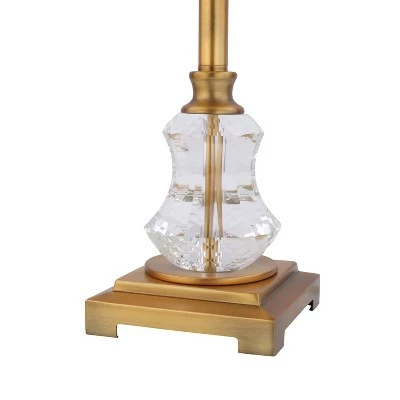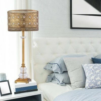 Add a glam touch of texture and style to your bedside table or living room end table with this Glam Brass and Crystal 1-Light Buffet Table Lamp from River of Goods. Made of brass in a brushed finish and studded with faceted crystal accents for additional sparkle, this ornate table lamp is sure to make an eye-catching addition to your interior decor while helping provide the room with pleasant multidirectional light. The candlestick-style base has large faceted crystal sections near the top and bottom, and a 60-inch cord provides plenty of reach to get to a wall outlet.