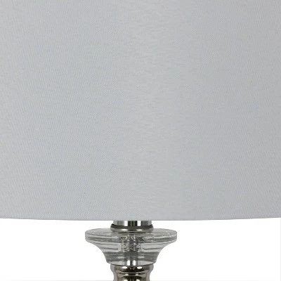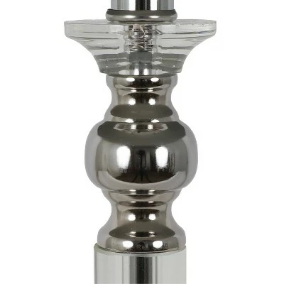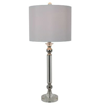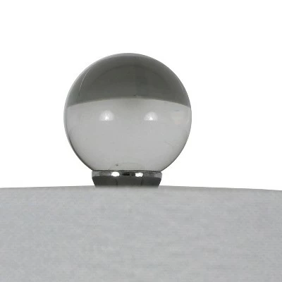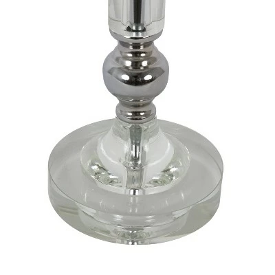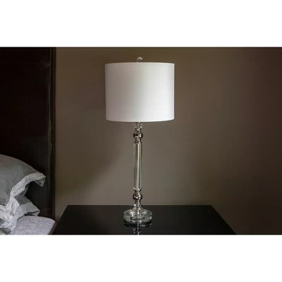 Bright and modern, the Rotunda table lamp shines with unique materials and construction. The center pole, finished in a high-shine chrome, is encased in a crystal clear casing for a transparent effect. The round globe at the lamp’s top is also crystal clear, while two chrome-finished accents appear at the top and bottom of the lamp’s base. A round white drum shade in a silky shimmer completes the look.