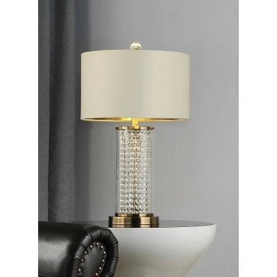 Elegant yet understated, this Crystal Pluviam table lamp is sure to please. The perfect addition to modern decor, this crystal table lamp features a cylindrical glass drum w/ stacked imported crystal beading strands cascading like waterfall to a crisp off white linen shade w/ matte gold lining for a dramatic effect and creates a stunning and clean appeal. Sleek and stylish, this crystal column table lamp is a living room or bedroom essential. Matte gold finish steel accents elegantly play up its chic, crystals and glass body, giving it a truly sophisticated look. Ideal for an end table, its off-white drum shade w/ matte gold lining creates the perfect amount of light for leisurely evenings at home. Add some glam to your decor with this wonderful accent light. Update any space instantly by adding this glam crystal glass table lamp.