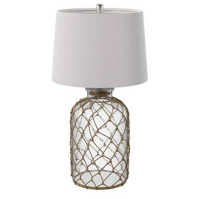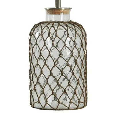 Accent your decor with this 30″ Seeded Glass 3-Way Table Lamp Netted Rope from the Signature Collection at StyleCraft Home Collection. This metal and glass table lamp features a netted rope detailing around the base of the lamp. The shade is made from off-white fabric and comes in a round, hardback design. The light bulb and shade rest on a quirky cork stopper design at the top of the glass base. This piece exemplifies superior product design and great styling at an unbeatable price. It will pair well with nautical and eccentric styling and is sure to be a conversation piece. Regardless if you put it in the bedroom or family room, this lamp stands out. Suitable for residential use in a dry location. This modern table lamp is UL listed in compliance with the nationally recognized safety standards.
