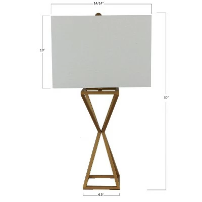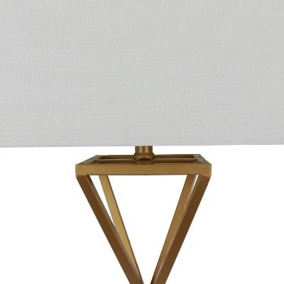 Sharp lines borrow from mid-century modern style in this open-frame table lamp. Finished in a metallic gold-painted shine, the lamp’s base is constructed of two inverted stacked pyramids, open framed and joined at the center for an hourglass-inspired silhouette. The trend of sharp, straight lines continues in the drum shade, which forgoes the traditional round shape in favor of a rectangle.