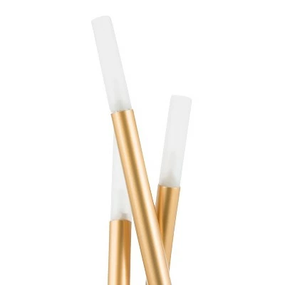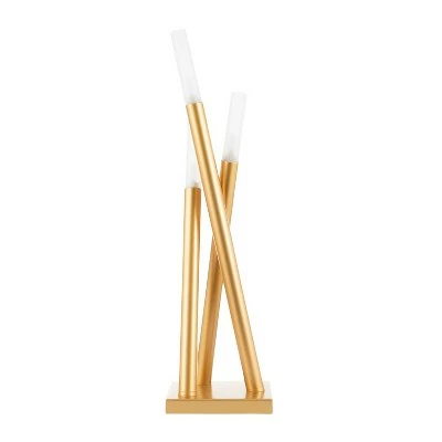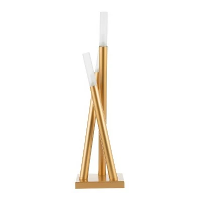 Cylindrical frosted sconces create a soft glow, accenting the modern design of the tubular metal arms on the Icicle Lamp. If you like a subtle contemporary look, this lamp is a perfect choice. Uses three 40-watt G9 halogen bulbs. This is the piece you’ve been looking for to elevate your decor! Available in brushed nickel and gold finishes.