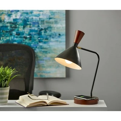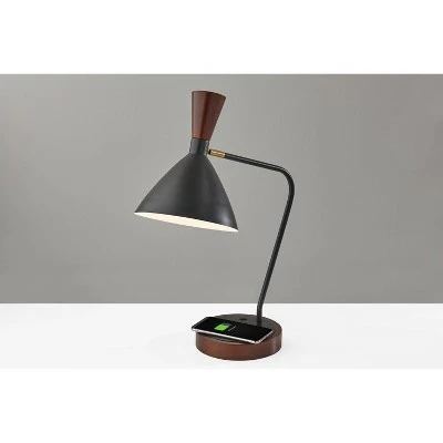 Stay connected with the Arlo AdessoCharge Wireless Charging Desk Lamp. With a Qi wireless charging pad and a USB port built into the base, you can charge up multiple devices at once! The Arlo Collection channels mid-century modern styling with an accentuated oversized shade silhouette. Walnut wood accents create a warm contrast to a matte black finish. An convenient on/off rocker switch is located on the base. Bulb is not included.