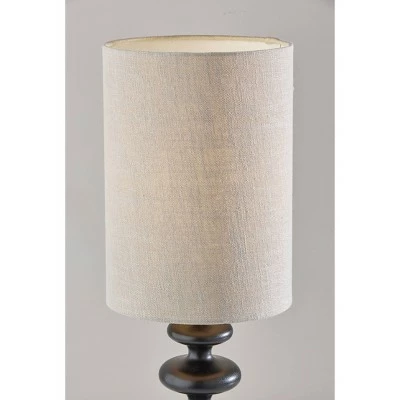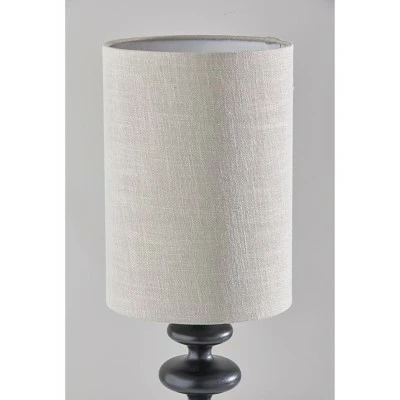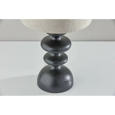 - A matte black finish is paired with a soft, taupe textured fabric shade.