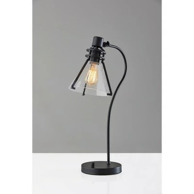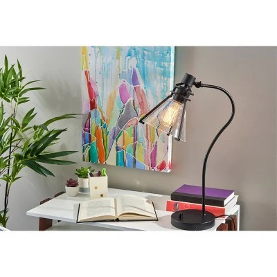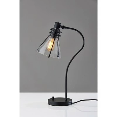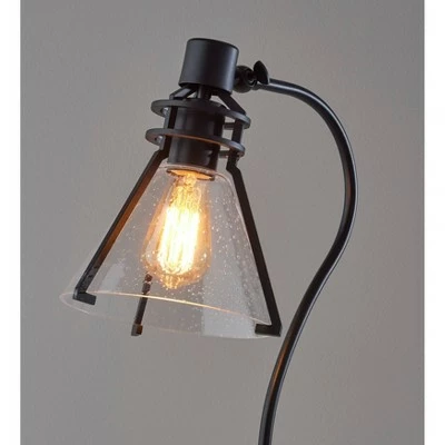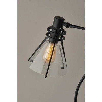 Defined by elegant lines and a blend of modern and vintage styling, the 24″ tall Beckett desk lamp adds a polished look to any space. It features a 7″ diameter round metal base in black finish supporting a matching tube-shaped arching stem. The metal shade frame in black finish consists of three arms that secure an inverted cone-shaped shade of clear, seeded glass. For a distinctive vintage look, the 5.5″ high and 7.25″ diameter clear shade leaves the included 60W Edison bulb visible. For adjustable lighting, the lamp has an articulation point at the base of the shade, allowing you to direct the light wherever it’s needed. Operated by a rotary switch located on the base to easily turn it on or off, the desk lamp also features a 70″ black cord. Complete your space’s look with the coordinating Beckett floor lamp, wall lamp, and pendant lighting.