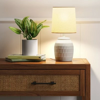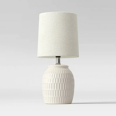 Illuminate your interior design in style with this White Embossed Scoop Pattern Ceramic Mini Lamp from Threshold™. This mini table lamp makes a welcoming accent to your tabletop decor. It features a white ceramic base with an embossed design for chic textured style. The white fabric shade completes the crisp modern look, while the simple on/off switch allows for easy functionality. Place it on any side table, console or sideboard for stylish and warm lighting.