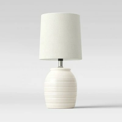 Lend an artful appeal to your indoor spaces with this Embossed Striped Pattern Ceramic Mini Lamp from Threshold™. Featuring a ceramic base in an embossed striped pattern, this mini table lamp is designed with a drum-shaped lampshade for a combination of sleek style and timeless flair. Plus, the LED bulb with white drum shade and one-way light setting gives your room a cozy ambiance and just the right amount of light for any time of day. Place this small lamp anywhere in your home — from the living room to your entryway console table to your bedside nightstand — for an inviting glow that’s perfect for creating a welcoming atmosphere in your home.