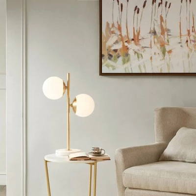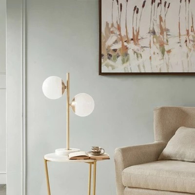 Update your space with the unique style of the Holloway Table Lamp. This table lamp features a white glass shade and a metal fixture with a gold finish for a striking contrast. The rounded shape creates a truly modern look for your living room or bedroom. Two Type A light bulbs are needed.