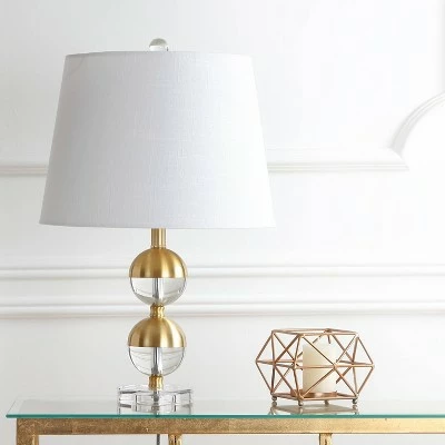 A duo of crystal and brass spheres adds visual interest to this 23″ mini table lamp. Best suited for end tables and living spaces, its small size packs a lot of punch. When illuminated, the brass accents reflect warm light from the bulb above.