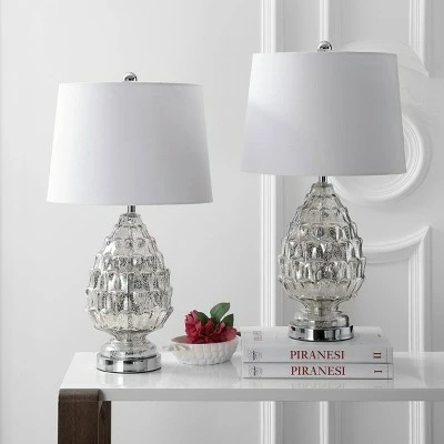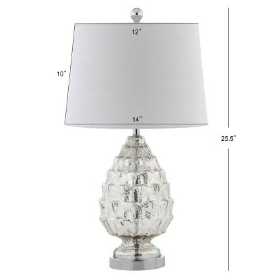 The antique mercury finish highlights the artichoke-style textured design on the body of this transitional glass table lamp. Finished in a white linen hardback shade, which adds classic tailoring to this antique-inspired base. Made with glass and finished with details like a silk-wrapped cord and chrome finial, this lamp is designed for dignified elegance and presence.