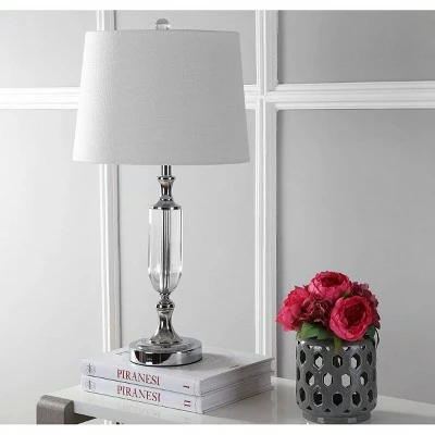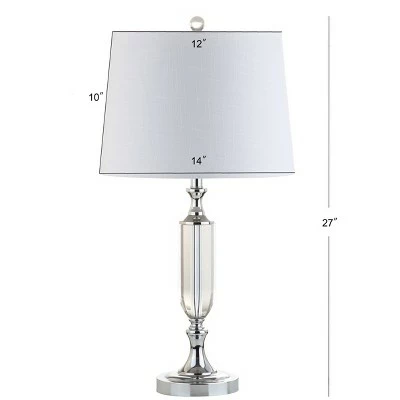 Refresh your decor with this striking crystal table lamp. The modern look features a slightly tapered shade atop a clear fluted-crystal base. A clear winner, this lamp stands out for its finishing touches — a crystal finial, chrome fittings, and a 60″ silk-wrapped cord complete the look.
