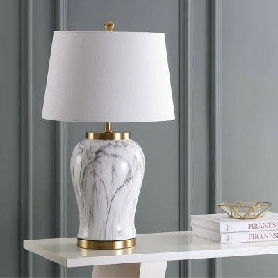 With its sturdy base and 28″ height, this ceramic table lamp is built to have presence. In a faux-marble effect created by a hand-painted glaze, its neoclassical inspiration is made modern by the gold fittings and linen drum shade. Style extends all the way to the plug, with a 60″ silk-wrapped cord.