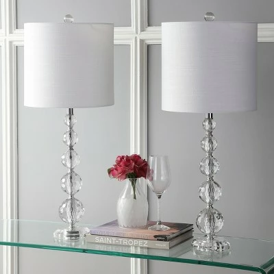 Modern yet timeless, the graduated sizes of the faceted crystal orbs on the base of this 28.5″ high table lamp will brighten any corner with style and light. At nearly 30″ tall, you’ll make a statement by adding a perfect pair on either side of a console or buffet, or use one to give your desk a designer touch with this updated take on a classic style. Crafted of a lead crystal base and finial, it’s finished with a bright white drum shade and silk-wrapped cord.