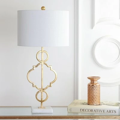A quatrefoil motif gives this table lamp a bit of far-flung flair. The marble pedestal lends a contemporary edge while the gilded iron finish is a nod to the classics. Topped with a white linen drum shade, it works well with a variety of home dĂ©cor styles — including your own!
