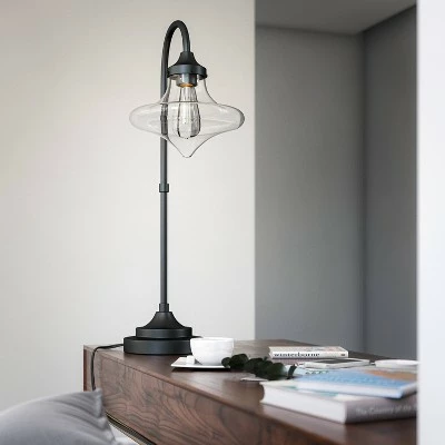 A futuristic and fun shade design is repeated throughout the modern industrial profiles of this funky table lamp. While the bronze finished body and hardware accents of this lamp are visually appealing, the uniquely “drop” shaped iridescent amber glass shades act as the central design piece, and beckon for attention. Intended for use with a vintage Edison bulb, now included, the unique contours of these glass shades warp and distort the view of the filament, creating a unique and spacey presentation of light.