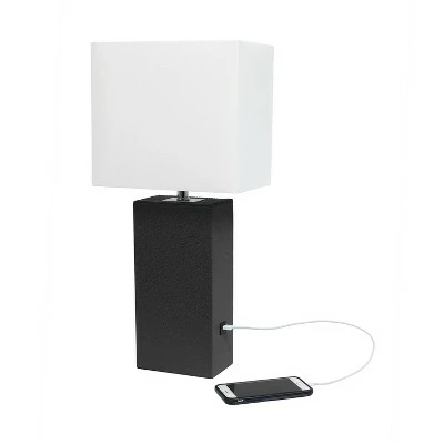 This simple yet modernized table lamp showcasing a leather body and white fabric shade is the perfect addition to your lighting needs. With a USB port on the side of the base, you are able to conveniently plug and/or charge your device. Our products are designed to enhance your room with elegance and sophistication.