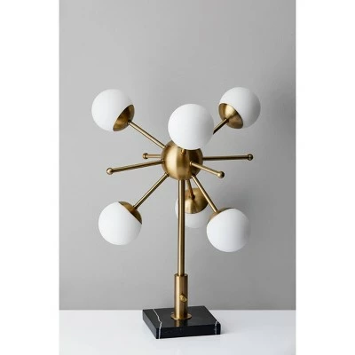 The Doppler LED Table Lamp has mid-century modern inspiration. Six white opal glass globe shades are clustered together to create a beautiful and eye-catching burst of light. An antique brass finish is paired with a square black marble base. This table lamp ships with six G9 replaceable LED bulbs that give off a total of 1,200 lumens of warm, ambient lighting. The sleek look is finished off with a black fabric covered cord. Bulbs are included. This lamp is smart outler compatible.
