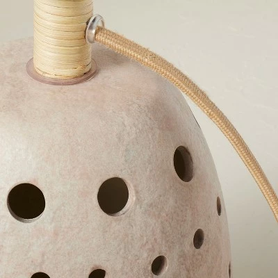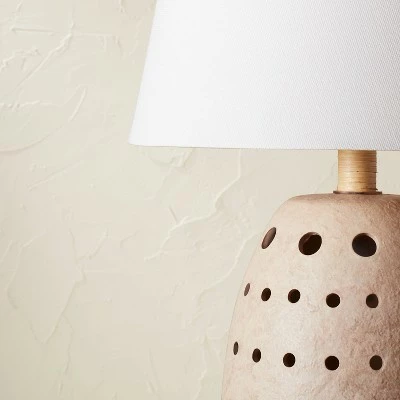Create an elevated look in your home with this Ceramic Cutout Table Lamp with Lit Base White (Includes LED Light Bulb) from Opalhouse™ designed with Jungalow™. Set atop an elongated, curved base, this ceramic table lamp features round cutouts that look stunning when the lamp lights up. The shade is covered with a white fabric that pairs well with the neutral base for a sophisticated style. Keep it on a tabletop near a shelf decorated with books, vases and more to add a decorative appeal to your space.