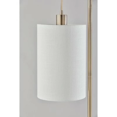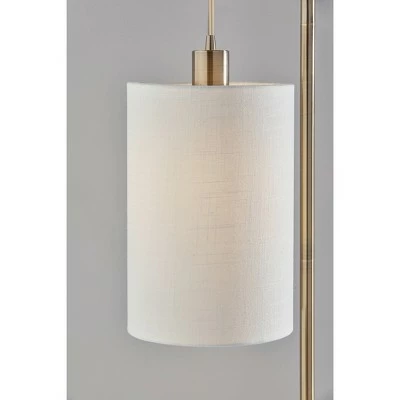 - An elegant antique brass finish is paired with an off-white textured fabric shade.