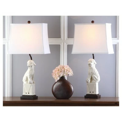 With a nod to the Far East, these stately Foo Dog table lamps add a worldly touch to any room. Crafted of ceramic with pure cotton shade and contrasting brown stand and fittings, this centuries-old design is refreshed with chic fashion colors. The Foo Dog table lamps by Safavieh is available in a variety of colors to best suit your personal tastes and decor. It has a rotary switch, a E26 bulb base type, and is sold in a set of 2.