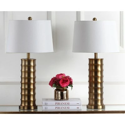 Handsome and quietly glamorous, the Safavieh Table Lamp in Gold and White Set of 2 comes in dark antique gold with a brushed finish. Crafted from metal, the thick cylindrical bodies of these table lamps each resembles a spine, with its stack of gently flared discs. These unique curves create an eye-catching silhouette. Made of white cotton, the lamp shades have a barrel shape and a subtle woven texture. Rounded metal finials add the finishing touch. Set includes 2 lamps.