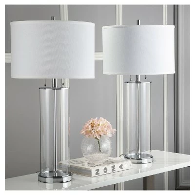 The epitome of style and substance, this clear modern glass table lamp (set of 2), offers world-class sophistication. Its contemporary spin on art deco style blends sleek chrome detail with the clean lines of its off-white cotton shade. A modern classic. The cool transparent composition gives off effortless glamour that makes it great for modern, contemporary, or transitional style rooms. The Velma Table Lamp is sold in a set of 2, has a chain switch, a E26 bulb base, and comes with two CFL bulbs.