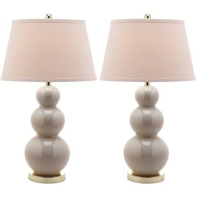 Balance fashion, form, and function with the Pamela Triple Gourd table lamp, its three beautifully turned light gray ceramic gourds graduating in size. With brushed gold stand and fittings, and crisp off white cotton tapered shade, Pamela adapts beautifully to any setting. Sold in sets of two. This set of two lamps are perfect for Glam or Transitional style homes.